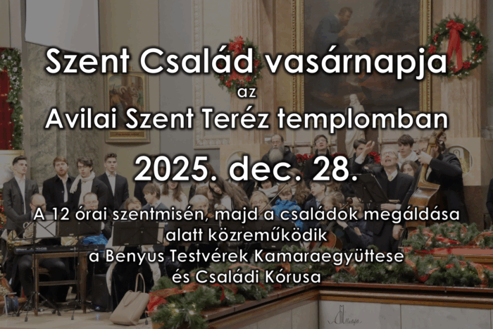 Szent Család vasárnapján, december 28-án az Avaliai Szent Teréz templomban a 12 órakor kezdődő szentmisén, majd azt követően a családok megáldásán közreműködik a Benyus Testvére Kamaraegyüttese és Családi Kórusa.